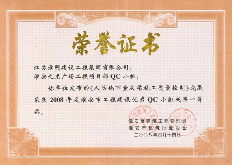 2008年市级QC一等奖(淮安九龙广场-人防地下室反梁施工质量控制)