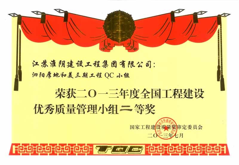 2013年度全国工程建设优秀质量管理小组二等奖(泗阳厚地和