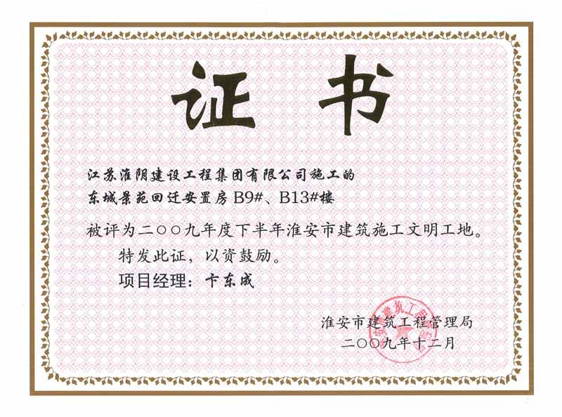 2009年市文明工地东城景苑回迁安置房B9#、B13#楼(卞东成)