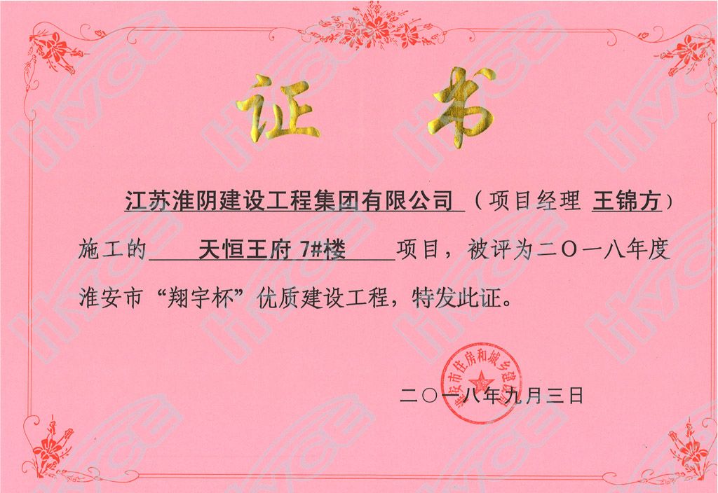 淮安市翔宇杯优质建设工程-天恒王府7#楼