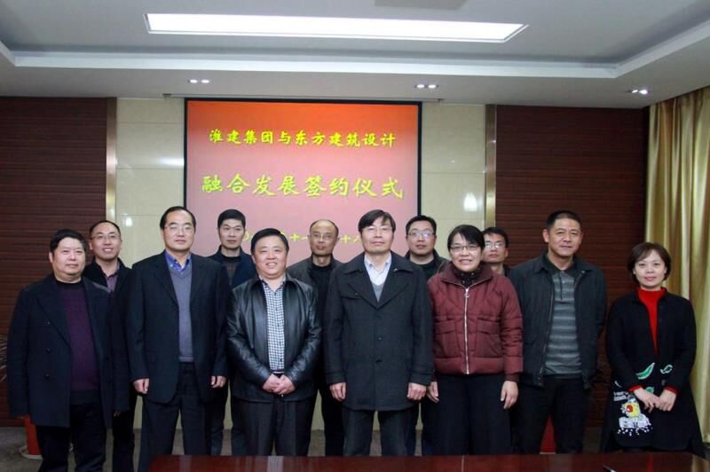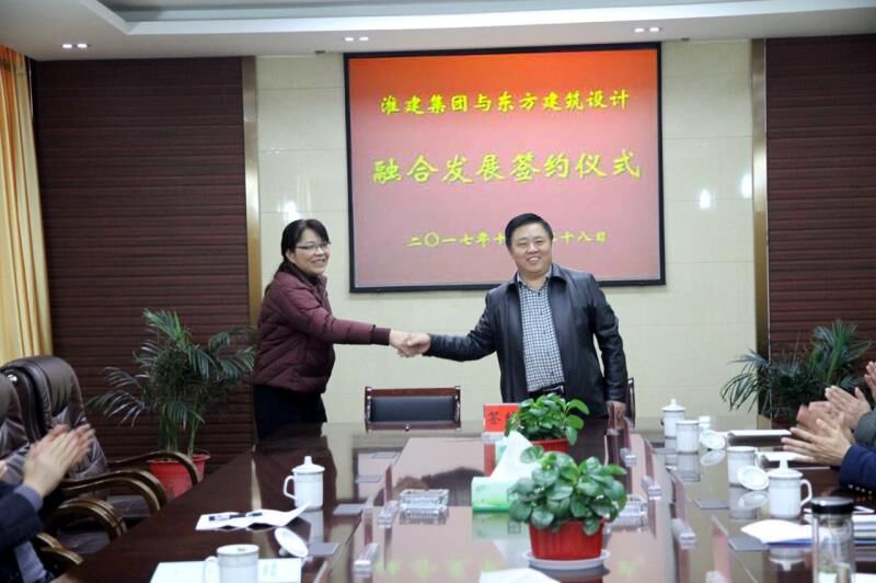 2017年11月28日下午,淮建集团与淮安市东方建筑设计有限公司举行了融合发展签约仪式,集团董事长胡从亮、东方建筑设计董事长吴家荣等出席签约仪式。根据双方协议,东方建筑设计向集团出让75%的股份,成为集团的成员企业,同时承揽集团总承包工程的勘察、设计等业务。