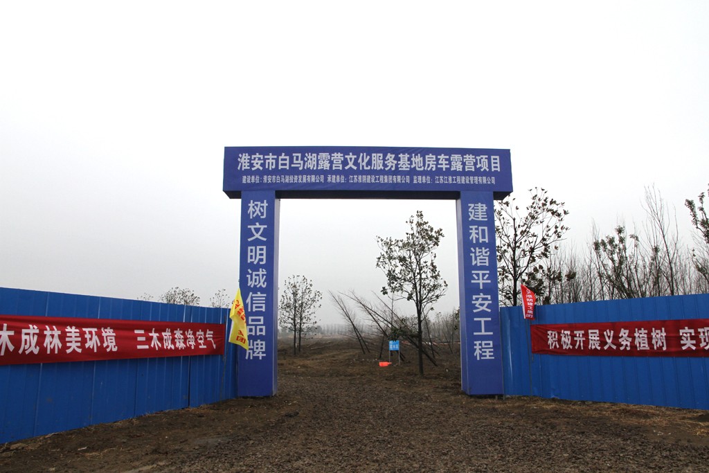 2月28日,集团白马湖露营文化服务基地房车露营项目工地彩旗招展,春意盎然。大门两旁悬挂着横幅标语:“积极开展义务植树,实现天蓝水净地绿”,“双木成林美环境,三木成森净空气”。